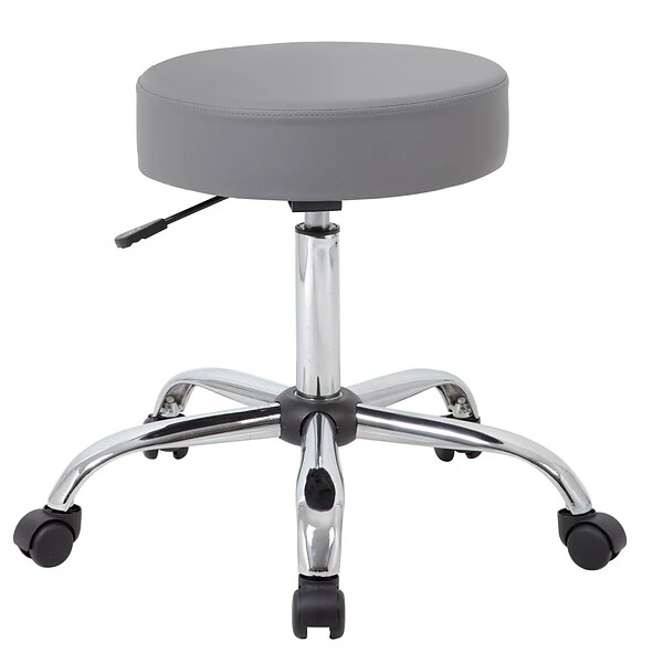This medical stool is upholstered in durable Grey, easy to clean antimicrobial vinyl, and equipped with a 4-inch thick molded foam seat that provides improved comfort and durability. It has an easy to reach gas lift seat height adjustment lever, providing a 6 inch vertical range to suit your comfort and work environment. Its base has an attractive chrome finish and provides great stability. Hooded double wheel casters make it easy to move and shift directions.