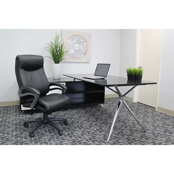 When it comes to comfort, our double layer executive chair will make sure you never settle for second best. It is elegantly upholstered in black Leather Plus, a comfortable combination of leather and polyurethane that provides softness and durability. In addition to its padded armrests and gun metal finish, it features pneumatic gas lift seat height adjustment and adjustable tilt tension control. All of this rests atop a large 27” nylon base with five hooded double wheel casters.