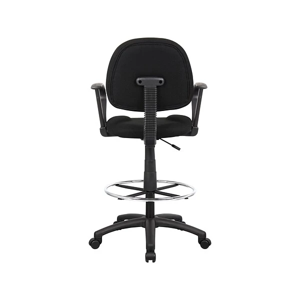 Easily-adjustable Boss drafting stool with fixed arms and a pneumatic gas lift seat height adjustment allows for limitless customization. A 20-inch diameter chrome foot with double wheel casters provides a stable foundation. The Boss black drafting chair is properly aligned with a large 27-inch nylon base to ensure balanced support.