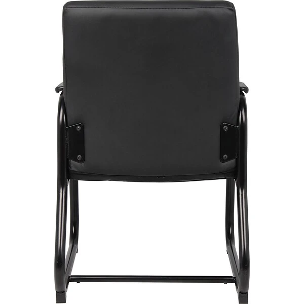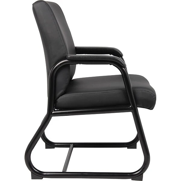 This Boss guest chair is made of Caressoft Vinyl that blends in with any environment and makes it look rich and sophisticated. The black chair guest has a weight capacity of 350 lbs. based on an 8 hour work day. This heavy duty guest chair is very comfortable and durable. The fixed arms of this sled base guest chair are padded to further enhance the comfort of your guests. This guest chair with arms meets or exceeds all American National Standards Institute / Business+ Institutional Manufacturers Associations safety standards and comes with a 6 year limited warranty.