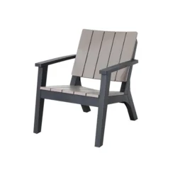 - Crafted from highly durable polypropylene with wood-like brushed texture; comes in gray with black chair frames