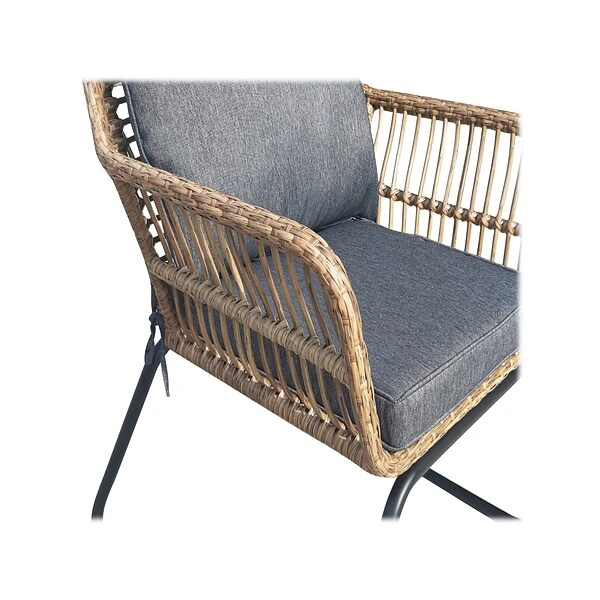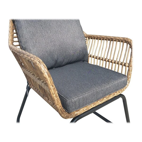 - Solid black powder-coated steel frame; beautifully wrapped in natural two-tone wicker PE rattan; gray polyester cushions