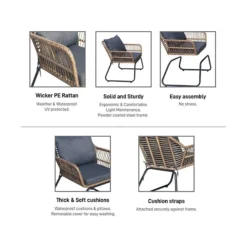 Modern-style all-weather DUKAP LUGANO patio two-piece armchair set with thick waterproof cushions for superior comfort. Features a solid powder-coated steel frame and is beautifully wrapped in natural two-tone wicker, comes with gray cushions. The cushions have straps to secure them against the frame and avoid them from slipping, always remaining in place. Easy to assemble and move around, this outdoor furniture set will add a touch of class to any outdoor venue. It requires low maintenance and will last for years.