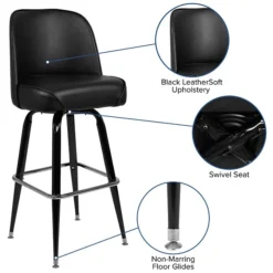 Treat patrons at your bar, restaurant, pool hall, or game room to this comfortably designed barstool. The bucket seat and enveloping, contoured back offers great support. The swivel seat offers an effortless transition for your customer. This commercial grade stool was built to withstand the daily rigors in the hospitality industry, but is still stylish enough for home use. The tubular footrest not only supports your feet, but acts as an additional reinforcement that helps secure the legs. This stool is also easy to clean, upholstered in a durable black vinyl cover.