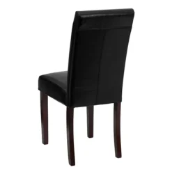 Less is definitely more with the simple but classic design of this set of 2 black LeatherSoft upholstered parsons chairs. LeatherSoft is leather and polyurethane for added softness and durability. Sleek lined panel stitching and a mahogany frame finish make this chair an elegant addition to your home, or home office. The armless design gives the illusion of space which appeals in small spaces. Strength and durability abound int his timeless piece that is built to last. High density foam padding over solid hardwood frame construction ensures the longevity of this accent chair. Parsons chairs are versatile and can be used not only in the dining room and kitchen but also as a reading chair or extra seating in the living room. Assembly takes less than 30 minutes with the included materials. Make quick work of spills and maintain the appearance of this side chair with a water based cleaner.