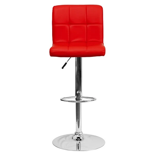 Let the plush quilted design of this this red adjustable height barstool cradle you in comfort. The simple design allows it to seamlessly accent any area in the home. The easy to clean vinyl upholstery is an added bonus when stool is used regularly. The height adjustable swivel seat adjusts from counter to bar height with the handle located below the seat. The chrome footrest supports your feet and relieves pressure from your legs while also providing a contemporary chic design. To help protect your floors, the base features an embedded plastic ring. Not only is this stool stylish, but very comfortable providing you with an amazing sitting experience!
