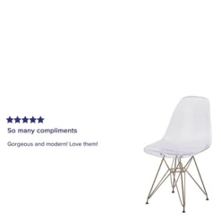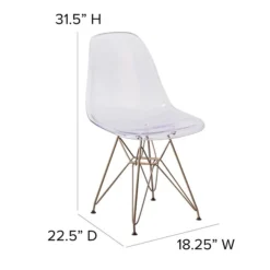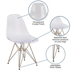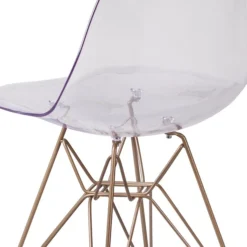 Rejuvenate your home with modern seating that will be a lovely addition as an accent chair in your living room, den, library or sitting room. This chair will add an attractive statement in your kitchen or dining room. The transparency of the chair takes up less space visually than with a solid chair to easily complement your office or waiting room. The smooth contours of the chair conform to your body allowing you to sit comfortably. The clear transparent finish with the gold geometric base add an artistic appeal.