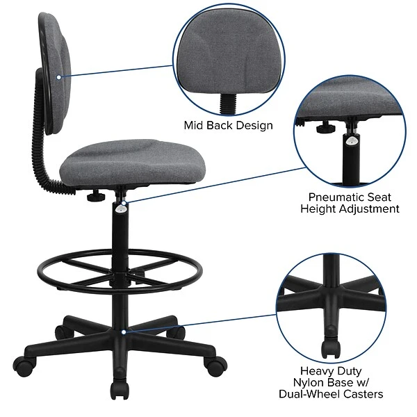 Customize your studio space with this drafting stool. With a gas lift height adjustment feature, a height-adjustable footrest and a five-pointed star rolling caster base, this stool is designed to keep you comfortable while you work. This Flash Furniture armless drafting stool has a durable metal base to ensure long-lasting use and durability.