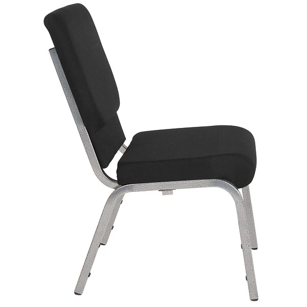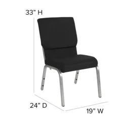 Flash Furniture HERCULES™ Series black fabric stacking church chair has a 4 1/4″ thick seat with a waterfall edge to minimize strain on the legs. Chair has silver vein frame finish and plastic floor glides to prevent floor damage.