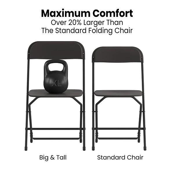Offering contoured comfort, and innovative design, this set of 4 big & tall, extra wide commercial grade plastic folding chairs is a must have for any occasion. The extra width and taller height of this all-weather folding chair is ideal for those with mobility issues, or prefer more spacious seating. Featuring dry-assist textured seats, these foldable chairs provide the highest level of comfort and security for any indoor or outdoor event.