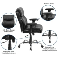 If your job or hobby requires you to sit for long stretches of time having the right chair is priceless. Big & Tall office chairs offer a broader seat and back width to accommodate larger and taller body types. This chair has been tested to hold a capacity of up to 400 lbs. A mid-back office chair offers support to the mid-to-upper back region. This office chair features black LeatherSoft upholstery and thick, plush padding to provide greater support. The tilt tension adjustment knob and tilt lock mechanism let you achieve a custom seating experience. The waterfall front seat edge removes pressure from the lower legs. The 360 degree swivel seat with pneumatic adjustment lever will allow you to utilize multiple work surfaces. The adjustable armrests take the pressure off the shoulders and the neck. The chrome base adds a stylish look to complement a contemporary office space.