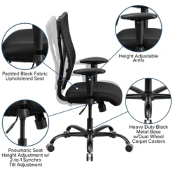 Finding a comfortable chair is essential when sitting for long periods at a time. This Big & Tall office chair offers a broader seat and back width designed to accommodate larger and taller body types and has been tested to hold a capacity of up to 400 lbs. High back office chairs extend to the upper back for greater support and relieve tension in the lower back, preventing long term strain. Mesh office chairs can keep you more productive throughout your work day with a ventilated back design that allows air to circulate to keep you cool. The waterfall front seat edge and extra large, height adjustable chrome foot ring remove pressure from the lower legs and promote better posture. A synchro tilt control allows the chair’s back and seat to recline at different rates. Chair easily swivels 360 degrees to get the maximum use of your workspace without strain.