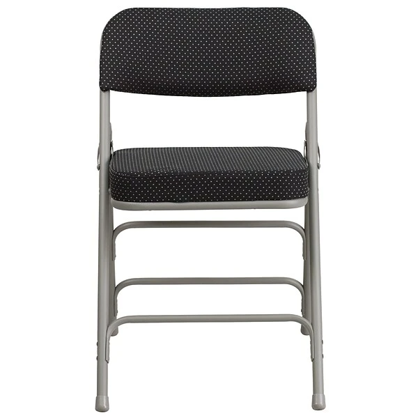 Guests will be amazed in the comfort of this Flash Furniture HERCULES Series ultra-padded upholstered metal folding chair. Whether you have planned for your guest’s arrival or had a sudden influx of family show up on your doorsteps, you’ll be well prepared with this padded folding chair. The chair provides comfort during extended meetings and social gatherings. Its 18-gauge curved powder-coated steel frame is triple-braced and double-hinged with leg-strengthening support bars to hold up to 300 lbs. Nonmarring floor glides on the legs protect your floors by sliding smoothly when you move it. Built for commercial use, this attractive chair is a smart seating solution for your next business meeting as well as in the home for family gatherings and other social events. After outdoor events, store indoors to protect the frame from extreme moisture. With nothing to assemble, this chair comes ready to service your needs.