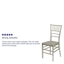 The lightweight Resin Chiavari Chair is ideal for weddings and special events. A solid colored frame doesn’t require re-painting and is UV treated.