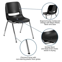 Flash Furniture Hercules Ergonomic shell stack chair in black color measures 29″ x 17 1/4″ x 21 1/2″ and has an elegant chrome frame. Armless chair for grades 3 – 7 has plastic floor glides for mobility.