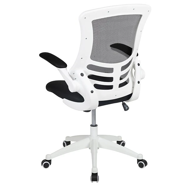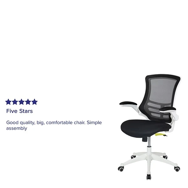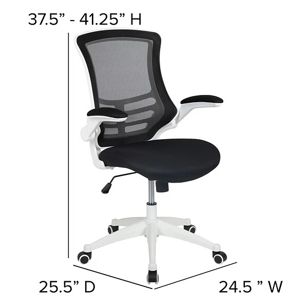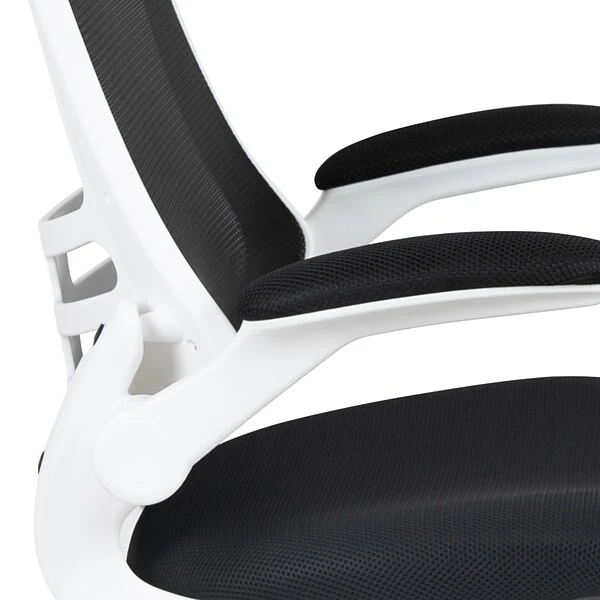 Break free from the norm of conventional office seating with this ultra-modern white frame office chair. Beat those hot summer days with the ventilated mesh back behind you, offering up huge airflow. The curved backrest has lower lumbar support to provide you with good posture support. This well-built ergonomic office chair with flip-up arms provide relief to your shoulders and neck but is also great for users who prefer an armless design. Flip-up arms allow you to roll your chair underneath the desk without adjusting the seat height. Adjusting the seat height is easy with the pneumatic lever. Turn the tilt tension adjustment knob underneath the seat to increase or decrease the amount of force needed to rock or recline. Whether meeting deadlines, chatting with colleagues, answering phones or perusing the internet this contemporary swivel office chair will meet your needs in your professional workspace or in your home office.