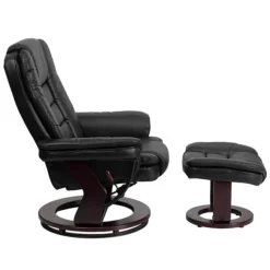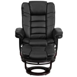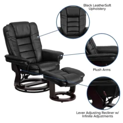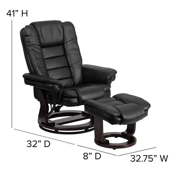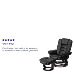There’s no better way to enjoy a movie, a book or just some down time than in a recliner. This set features thickly padded arms and tastefully exposed wood frames. This uniquely designed recliner features a ball-bearing Swivel base that makes Swivel effortless. This set is not only perfect in the home, but makes for a great addition in the office. The durable leather upholstery allows for easy cleaning and regular care. For easy maneuverability, this recliner has a ball-bearing swivel base and its ottoman has a wood base with floor glides.
