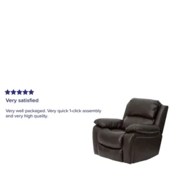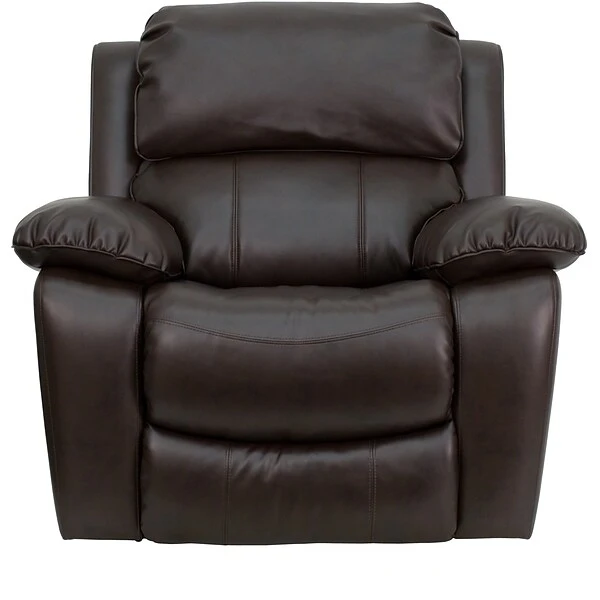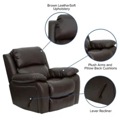The Brown Leather Rocker Recliner with generously padded arms and bustle back cushions cradles you in comfort.