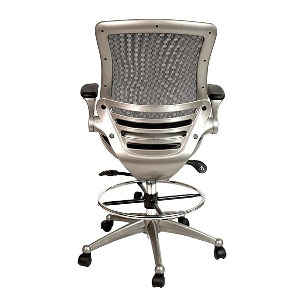 When you spend more time at your desk than anywhere else it’s time to invest in a top-notch chair. This high quality drafting chair is constructed with a higher seat range to reach counters and bars. Featuring breathable mesh material and extra padding throughout, this drafting stool will keep you cool and comfortable. Our adjustable-height drafting chair effortlessly raises and lowers via an easy-to-operate pneumatic adjustment lever while the integrated chrome foot ring provides a comfortable place for your feet to rest. The waterfall front seat edge helps reduce pressure on the lower legs. Padded armrests flip up and out of the way. Synchro-tilt control lets the chair’s seat and back recline at different rates and the contoured back with lumbar support may help to alleviate strain. 360 degree swivel paired with dual-wheel casters allows you effortless mobility. Spills clean up easily with a solvent based cleaner, no water required.