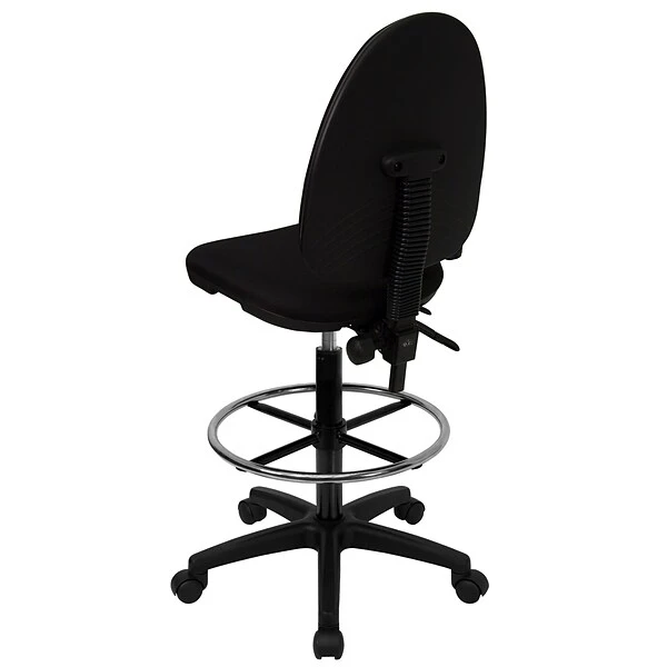 Flash Furniture Mid-back black fabric multi-functional drafting stool features height adjustable chrome foot ring with pneumatic seat height adjustment for comfort seating. Stool has adjustable lumbar support to reduce back pain.