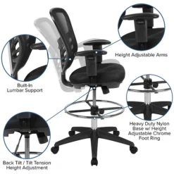 Discover a new way of office seating with an ergonomic drafting chair. With a rise in standing desks you need a compatible office chair to travel the distance with you. Enjoy the comforts of an ergonomic office chair in a taller frame to meet the needs of students and professionals working at above average desk heights. If you’re seeking an office chair to work at above standard heights in environments, such as banks, architectural firms, art studios and other creative spaces a mesh back drafting stool is your perfect match. This draft chair features a ventilated mesh back with lumbar support to keep you cool along with a convenient lever to adjust the seat height and lock the seat in place to prevent you from rocking. Turning the tilt tension adjustment knob increases or decreases the amount of force needed to rock or recline. From standing desks to drafting desks this ergonomic drafting chair with contoured padded swivel seat will provide you with the comfort that you need to suit your work environment. Let this tall task chair deliver comfort while you scratch items off your to-do list.