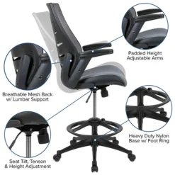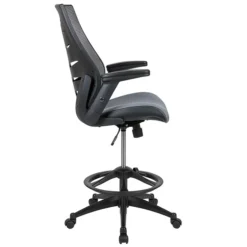 Make your daily tasks at work more pleasant with a high office chair designed especially for your high desk table needs. This tall task chair is ideal at sit-to-stand desks, standing desks, bar height tables and drafting tables. This mesh back drafting chair will make your receptionist’s desk look professional as visitor’s are being greeted. Enjoy the comforts of an ergonomic chair in a taller frame to meet the needs of students and professionals working at above average desk heights. No more miserable summer days at work when you have a mesh back office chair that’ll keep airflow circulating. The curved high back cradles you while offering built-in lumbar support.
