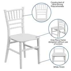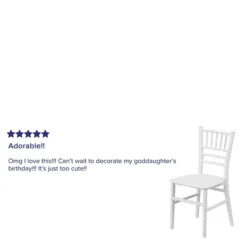 The elegantly designed Flash Furniture kids white resin chiavari chair is a delightful option to make kids feel like VIPs at your special events. This mini version will fit right in with the classic adult-sized chairs. With a frame made from ultra-strong resin, this lightweight chair can hold up to 330 lbs. It features a one-piece frame, with wobble-free, polypropylene construction. They’re stackable up to 10 chairs high to transport and store and ship to you fully assembled.