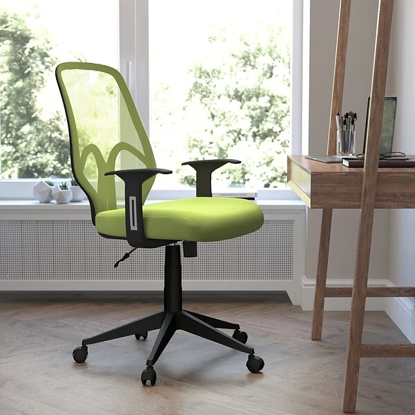 Breathe new life into your office, dorm or home office with this comfortable High Back Mesh Chair. The transparent mesh back allows air to circulate, keeping you cool no matter how high the pressure gets. The swivel seat is foam padded and has a waterfall front for leg comfort. Built-in lumbar support helps prevent back strain and muscle fatigue. Raise and lower the seat using the pneumatic seat height adjustment lever, conveniently located below the seat. The heavy-duty, nylon base with dual wheel casters makes it easy to roll across the floor. Whether you’re studying, browsing or on a tight deadline, this stylish chair will keep you cool and comfortable throughout your busy day.