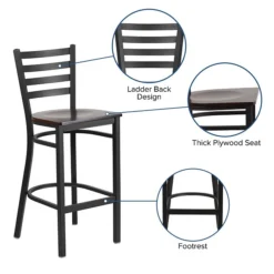 Commercial furniture needs to be both durable and low maintenance so metal barstools are a popular choice for furnishing restaurants, pool halls, lounges, bars and other high traffic establishments. This stool is easy to clean, which is an important aspect when it comes to a business. Built to withstand the everyday hustle and bustle in the restaurant and hospitality business, these dining stools will also look great in your home. The beautiful wood seat and ladder back design will keep guests comfortable. The frame is stabilized using two welded support bars, which includes a footrest to prevent leg discomfort. The floor glides help protect your floors and ensure smooth gliding. Use this bar height stool in your kitchen, dining room or home bar and give your decor a fresh look. The simple and lightweight design of this stool will not disappoint, whether used in the home or your commercial business.
