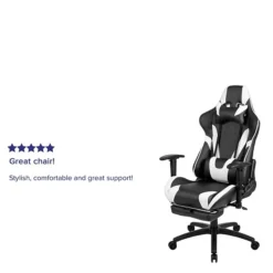 Surpass your game achievements when you are seated comfortably atop this racing gaming chair with extended footrest to properly elevate your feet. Removable and adjustable headrest and lumbar pillows provide comfort while the adjustable pivot arms support your upper body. Gamers need ergonomic office chairs and this chair includes a lever to recline the back 87° ~ 145°. Enjoy hours playing your favorite video games on this ergonomic PC chair. Enjoy a good game after work to release the stresses of the day. Slide the footrest out by pulling the loop then flipping the footrest up. Whether you need to lean back just a little or a lot this adjustable back office chair has your back. Complete your gaming experience with our red gaming ergonomic desk with cup holder and headphone hook or black gaming desk with cup holder, headphone hook, and monitor/smartphone stand.