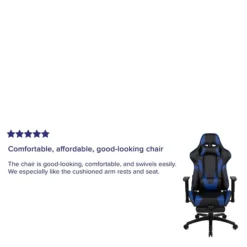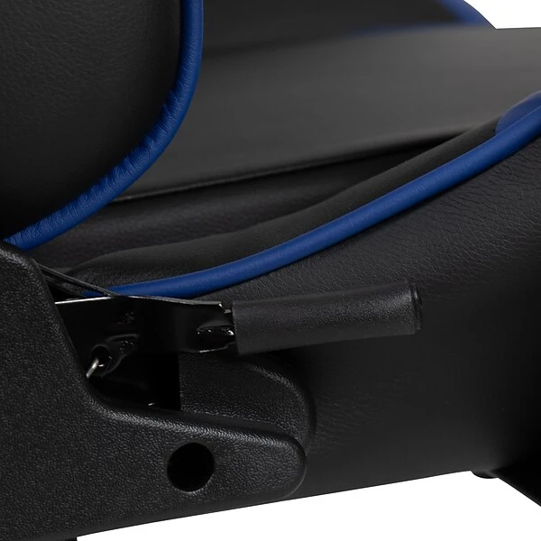 Have game day any time on your PC or with your console of choice with this blue racing gaming chair. Featuring a reclining back and slide-out footrest covered in soft and durable LeatherSoft upholstery, this high back ergonomic office chair is a must have. Adjustable headrest and lumbar pillows can be repositioned where you need them or removed. Adjustable pivot arms relieve pressure from your neck and shoulders. Slide the extended footrest out by pulling the loop then flipping the footrest up to properly elevate your feet. A separate lever reclines the back 87° ~ 145° while the lever underneath the seat controls the seat height and locks the chair in an upright position. This faux leather gaming chair cleans up easily with a solvent and water based cleaner such as foam. Complete your gaming experience with our black gaming desk with cup holder, headphone hook, and monitor/smartphone stand.