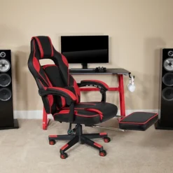 Sit back, take a deep breath and get ready to have your mind blown when you take a ride in this reclining gaming chair with massager. This cool looking two-tone game chair has a removable lumbar pillow to support your lower back and massage those tense muscles when you plug in the attached 3 ft. USB cord. When you need a breather, recline this high back chair 95° ~ 175°. The arms actually recline along with the back to keep you comfortable. Pull the loop to slide out the footrest, flip it up and take a quick power nap to recharge. Video game chairs are designed specifically for gamers comfort but will make an excellent ergonomic chair for the office, dorm room, or home office. Get the ultimate gaming experience when you add our black gaming desk with cup holder, headphone hook, and monitor/smartphone stand.