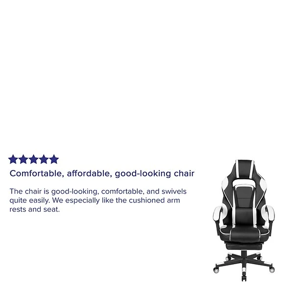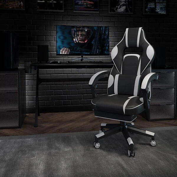 Sit back, take a deep breath and get ready to have your mind blown when you take a ride in this reclining gaming chair with massager. This cool looking two-tone game chair has a removable lumbar pillow to support your lower back and massage those tense muscles when you plug in the attached 3 ft. USB cord. When you need a breather, recline this high back chair 95° ~ 175°. The arms actually recline along with the back to keep you comfortable. Pull the loop to slide out the footrest, flip it up and take a quick power nap to recharge. Video game chairs are designed specifically for gamers comfort but will make an excellent ergonomic chair for the office, dorm room, or home office. Get the ultimate gaming experience when you add our black gaming desk with cup holder, headphone hook, and monitor/smartphone stand.