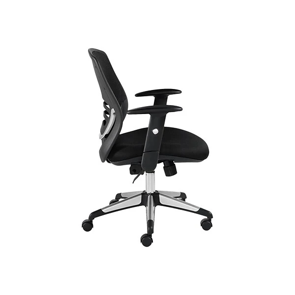 Make working for extended periods of time more comfortable with this black Global mid-back mesh manager’s chair. The supportive seat has an arched five-star base with scuff-resistant tips that help distribute weight evenly, while twin wheel carpet casters roll smoothly on multiple surface types. This chair is made with soft mesh fabric and titanium accents for lightweight breathability and sleek, sophisticated style. An adjustable armrest works alongside the swivel and tilt features, so you can customize the chair to fit your body perfectly.