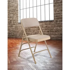 Made with comfort, elegance and strength in mind, the 2300 Series fabric-upholstered folding chair is made with stain-resistant Scotchgarded fabric covering 1¼”-thick foam on our most popular frame. This features our unique full-size, double-contoured backrest, upholstered and firmly secured to the frame by six rivets. The institutional-grade frame is made from heavy-duty powder-coated 18-gauge round tubing with three U-shaped double-riveted cross-braces – one in front and two in the back – to securely support the double-hinged legs. Color-coordinated V-tip stability plugs provide added reinforcement at the frame’s junction and matching replaceable glides prevent floor damage. The 2300 Series meets MAS Certified Green and ANSI/BIFMA standards.