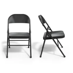 Create seating for meetings, events, or other gatherings with these black folding chairs. The sturdy metal construction offers added durability, while the covered foot caps protect floors against scratches and scuffs. The simple design coordinates with a range of furnishings, making these chairs a versatile addition to your business. Each chair folds away and stacks neatly for convenient storage. With curved seat backs and integrated foot rails, these Staples metal folding chairs offer added support for long hours of use.