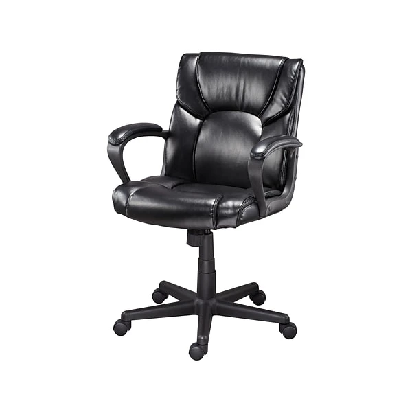 Stay comfortable while you work in this Staples Montessa managers chair. Plush cushions and padded armrests provide added comfort, and built-in lumbar offers support for your back during long hours at your desk. The soft upholstery looks and feels just like real leather for an elegant finishing touch. Use the pneumatic seat height adjustment and tilt tension to find then lock the perfect setup for your body. This Staples Montessa managers chair features rolling casters, so you can reach every corner of your office without standing up.