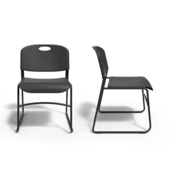 Give visitors or staff a convenient seating option with these black stacking chairs. The contoured seats and seat backs offer added comfort for long hours of use, while the durable resin construction and solid steel rod frames stand up to frequent use. Each chair boasts an integrated handle, making it easy to carry them from one location to another. With their stacking design, these plastic chairs take up minimal space in storage areas.