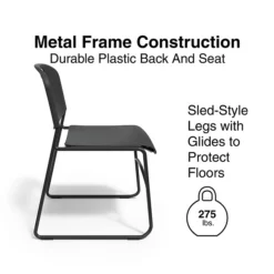Give visitors or staff a convenient seating option with these black stacking chairs. The contoured seats and seat backs offer added comfort for long hours of use, while the durable resin construction and solid steel rod frames stand up to frequent use. Each chair boasts an integrated handle, making it easy to carry them from one location to another. With their stacking design, these plastic chairs take up minimal space in storage areas.