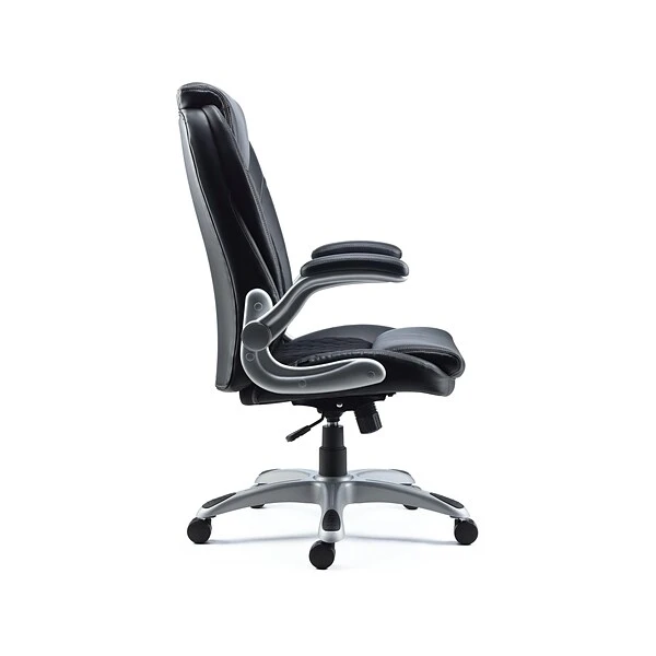 Outfit your executive office with this Sorina office chair. The soft quilted back and bonded leather accents deliver modern style, and the plush padding cradles your frame for all-day comfort. Built-in lumbar support and flip-up padded arms, making it easy to get in and out of the seat. Tilt tension, tilt lock and seat height adjustments provide convenient customization, so you can get the perfect fit for the busiest of workdays. Featuring a five-star base and sturdy rolling casters, this Sorina office chair glides effortlessly across office floors.