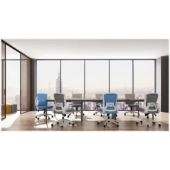 - Durable white nylon frame with a mesh back and seat covered in blue fabric