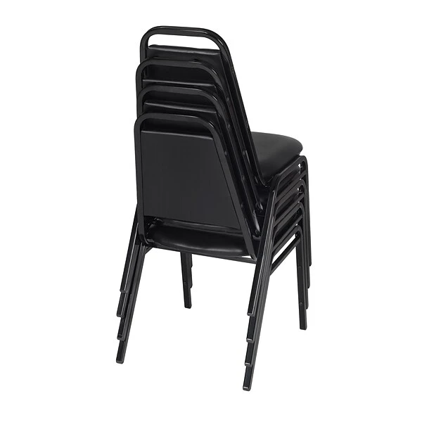 The Restaurant Stacker is for more than just restaurants! Inspired by the classic black cafe look, this stack chair is designed for use in almost any setting- lunchrooms, break rooms, cafeterias, auditoriums, and more! The water-repellent vinyl seat and back easily wipe clean with a damp cloth. Reinforced cross-bracing on the black metal frame back this versatile stack chair suitable for every day wear and tear. The Restaurant Stacker can easily be stored away in stacks of 12. This chair ships assembled and is ready to use immediately. All Regency chairs are backed by a 5-year limited manufacturer’s warranty on chair bases and frames and a 2-year limited manufacturer’s warranty on chair mechanisms and upholstery.