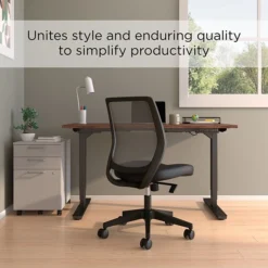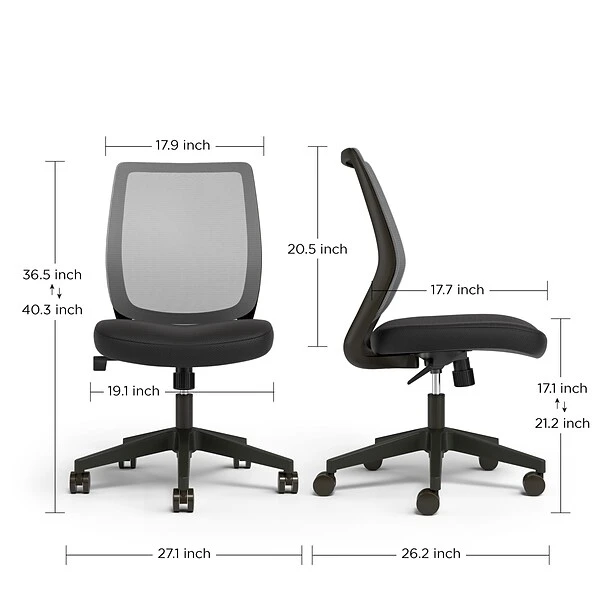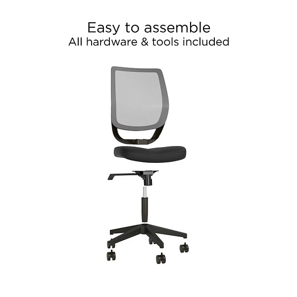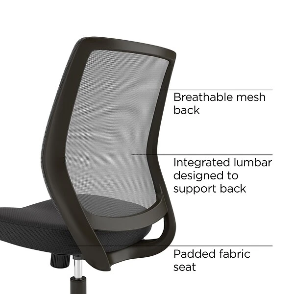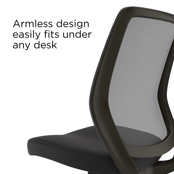 Set up an optimized ergonomic workstation with this armless mesh back fabric chair. The contoured seat and cushioned padding help absorb your weight and offer reliable support, while the mesh back promotes the flow of cooler air, releasing trapped heat. Calibrate the tilt resistance of the chair as you recline with the convenient tilt tension knob, and support proper posture with the adjustable seat height. An upright tilt lock lets you enable and disable the recline function easily, while the armless design means you can slide this seat under your desk to maximize office space. The five casters on this Essentials black mesh back fabric chair support effortless mobility throughout your office.