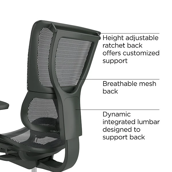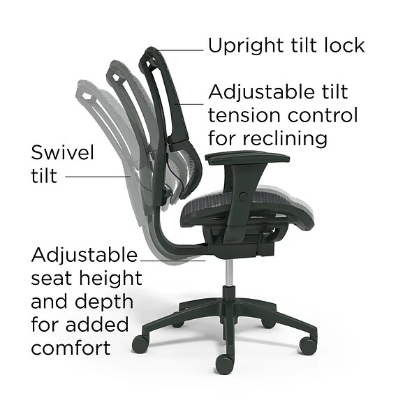 Upgrade to an upscale seating solution with this mesh task chair. Integrated lumbar support minimizes the strain on your back as you work long hours, while the accessible lever adjusts your seat height for better posture. The tilt tension knob lets you configure the recline function effortlessly, and the synchro-tilt seat plate facilitates a natural reclining motion. Adjustable armrests offer easy customization, while the infinity tilt lock easily locks in an upright or angled position for flexible options. This FlexFit 1500TM black mesh task chair has five caster wheels, so you can move freely around your work area, and meets ANSI/BIFMA standards for product safety and durability as a reliable update option for your desk.